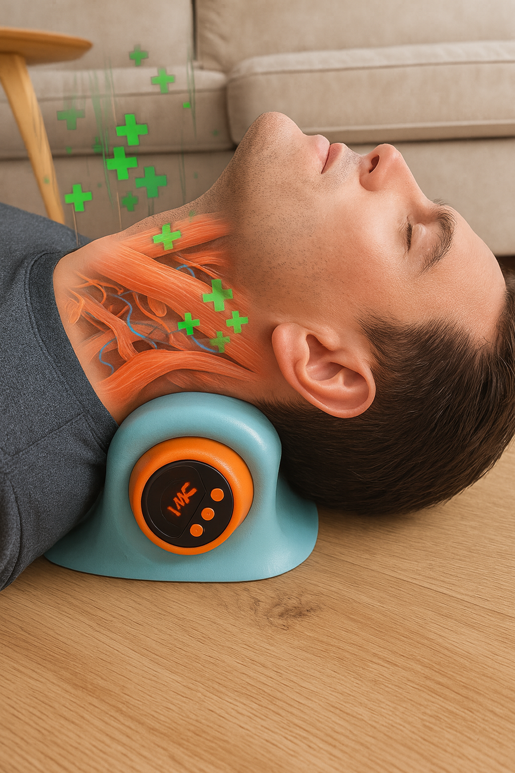 De nek-schouder massage apparaat is ideaal voor de behandeling van nek-, schouder- en bovenrugpijn, nekbult/weduwbult, voorovergebogen hoofdhouding, beknelde zenuw in de nek, TMJ, spanningshoofdpijn.