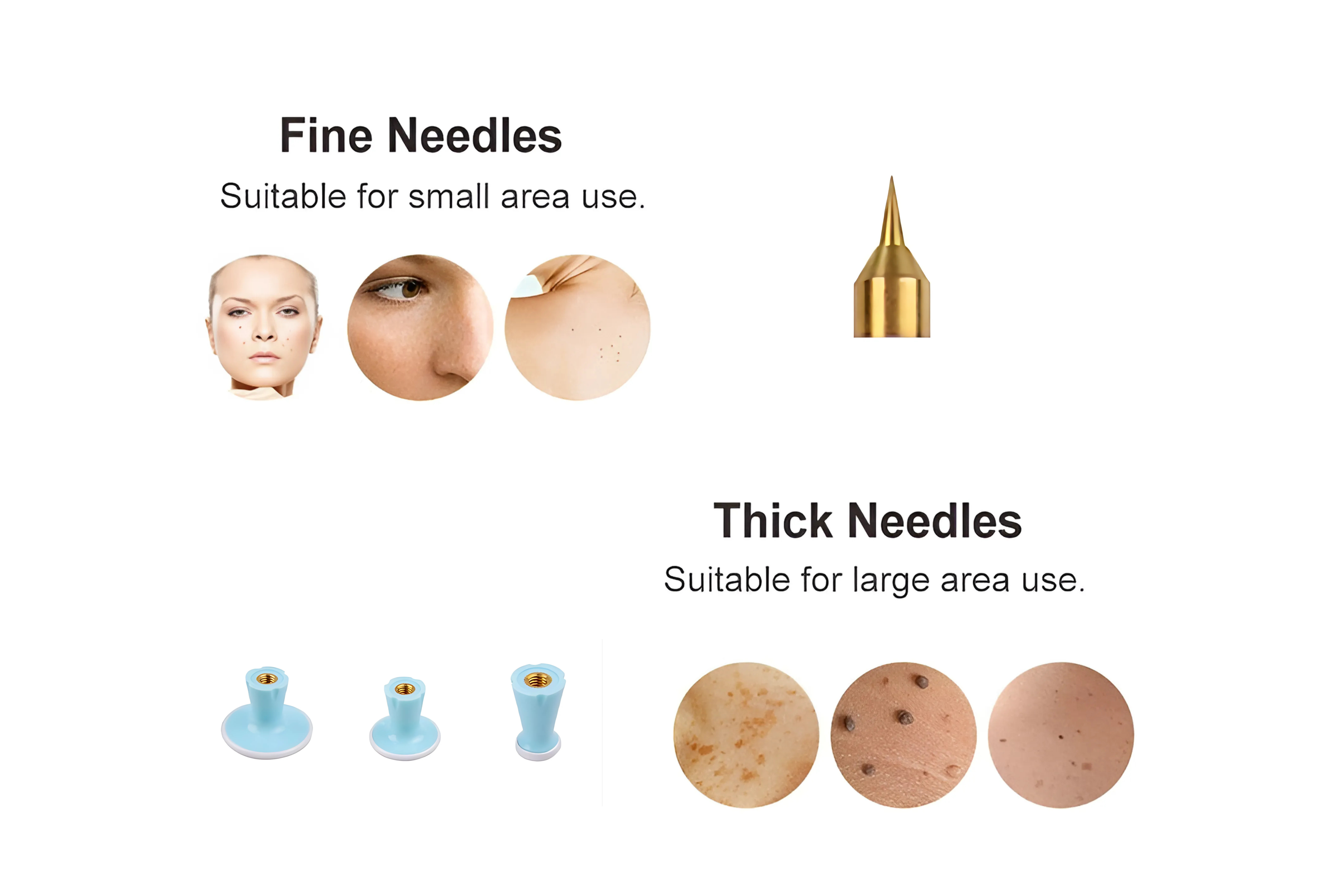 De set bevat meerdere opzetstukken en naalden voor diverse behandelingen, zoals huidversteviging en het verwijderen van kleine oneffenheden.